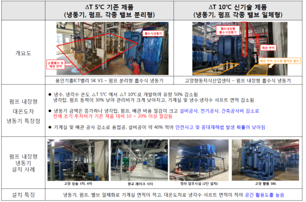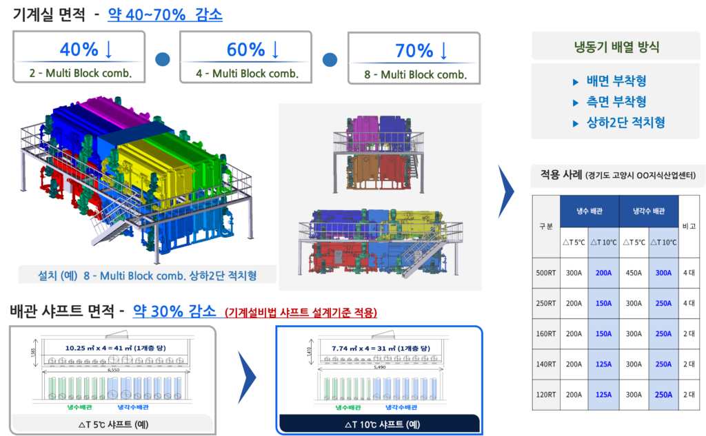 대온도차로 인해 유량 50% 감소, 냉각탑, 펌프 동력이 30% 낮아져 배관경이 작아지기 때문에 냉각수 샤프트 면적과 관리비가 크게 감소됩니다.